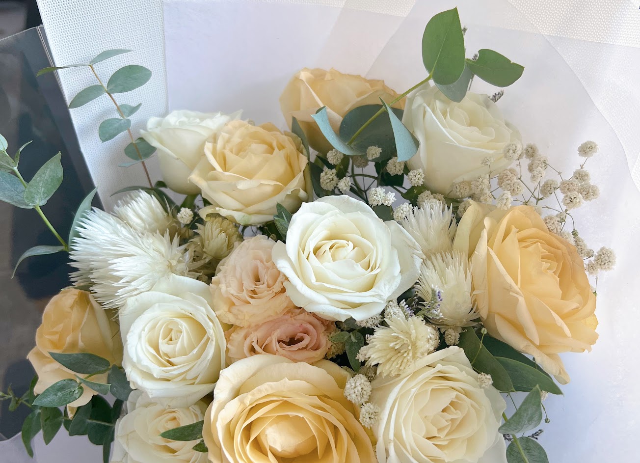 星期一早需要結婚登記花束,預約星期天傍晚提前拿,當天取花時,店裡阿姨知道隔天才要使用,表示當天的比較新鮮漂亮,叫我隔天順路再拿,原早上九點營業,為了我八點多就來製作花束,真的太感動了!大推??花束配色好美好喜歡? …