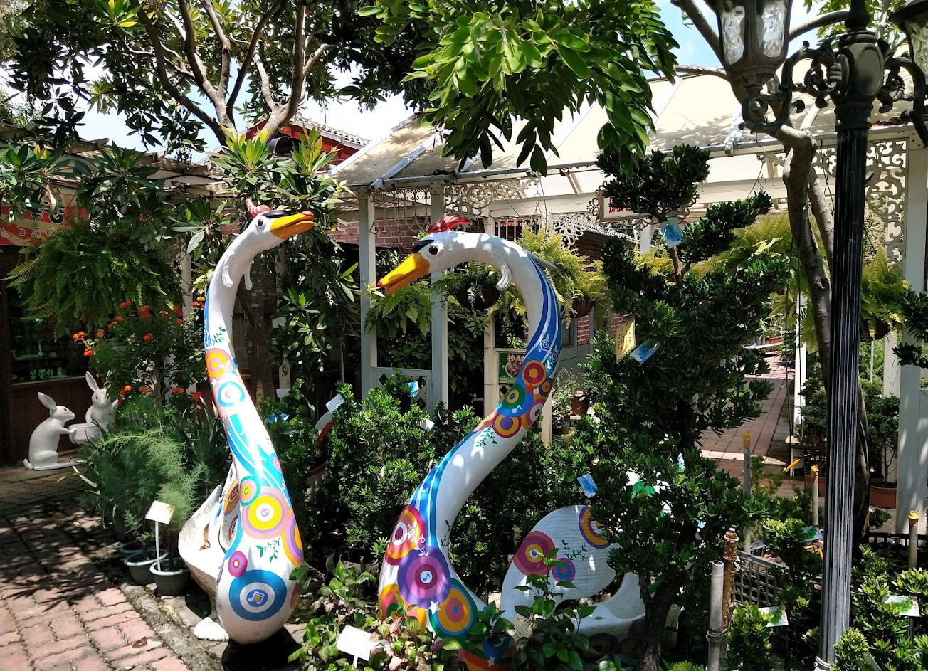 [鳳凰花園 奇花異草 手推式購花推車] 鳳凰花園,入口拱門一對紅色鳳凰讓人印象深刻,園區空間寬敞佔地1000坪,四季五彩繽紛的草本花卉及小品盆栽,分門別類井然排列,種類多達2800種,並且還有許多市面上不常見到的奇花異草,讓人愛不釋手,想要通通買回家。過去遊客買花都需要費力搬盆,鳳凰花園許老闆改裝草莓車,首創鋁合金四輪購花推車,讓遊客輕鬆愜意的推著推車,宛如逛賣場自主購物,一邊賞花一邊挑選最漂亮的盆栽。從大門進入,整個賣場都有銀網遮蔭,一路向後逛,可以到達鳳凰花園的後花園,這裡有一棟三合院與三棵老樹 (芒果樹、鳳凰木與楓香),陽光灑落風吹沙沙,抬頭可見松鼠跳躍枝頭,小徑旁還有一池水生植物。後花園有間以飲品和輕食為主的「窄巷古厝咖啡」,懷舊復古不需修飾渾然天成,逛累了歇歇腳,是一個很好的休憩空間。