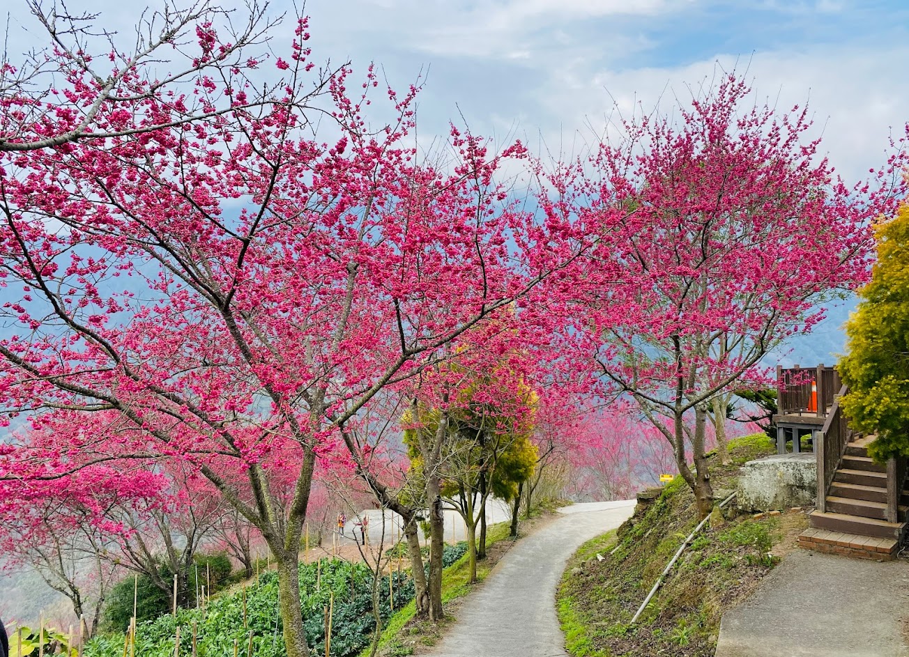 上千棵的櫻花,種在之字型賞櫻步道兩側,須出動空拍機才能看到全景。不過走到步道之間,或俯視或仰望,也有別具一番風味。