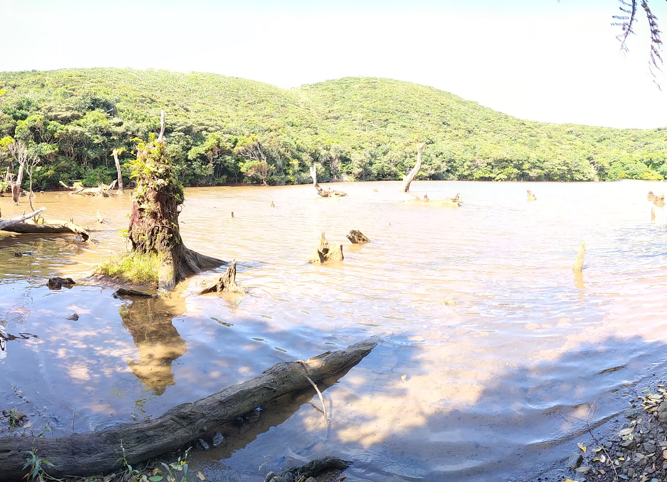 蘭嶼的大天池並不一定都有水,這個地方需要靠運氣,聽當地的導遊說要連續下好幾天的雨上面才有可能會積水,算是一個非常賭運氣的景點。實際爬過一次之後覺得這個景點的性價比不高,但是都來到蘭嶼了不排一下天池,也真的是很可惜所以還是建議大家上去。這裡的路非常的危險,一定要跟在地的導遊,不然你走完石板組成的樓梯之後就很容易開始迷路了,我去的前一天跟當天都有下毛毛雨路,非常的難走同團的人也滑倒了好幾次,鞋子跟拐杖還有輕便的道具都需要注意,有一些地方需要靠爬繩子才過得去,所以真的要斟酌一下體力。 到了上面去之後是一片平原聽,在地導遊說這裡以前是火山口,只是之後被泥沙堆滿了,這裡有很多椴木跟枯木,整體而言非常有古戰場的感覺,陽光照下來有不同的寧靜跟沉靜感,可以體驗在蘭嶼裡面更遠離村落的感覺