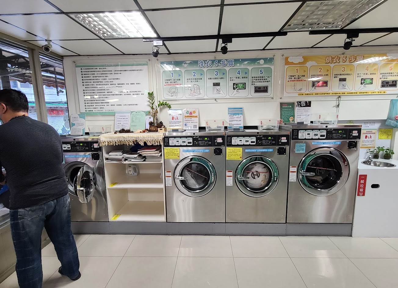 自助洗衣,在乎的不外是乾淨,有事情可打發時間,白天隔壁就是南京三民市場,晚上附近也有些商店可逛逛,也可在電內滑手機