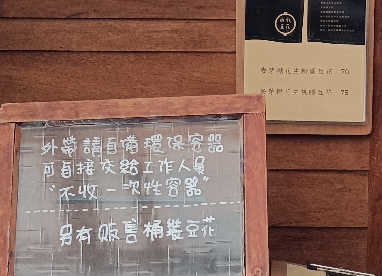 內用可以選擇坐著吃/站著吃,外帶限使用環保容器(保鮮盒) 豆花細緻,粉圓不會太甜,加了花生糖吃起來脆脆的!