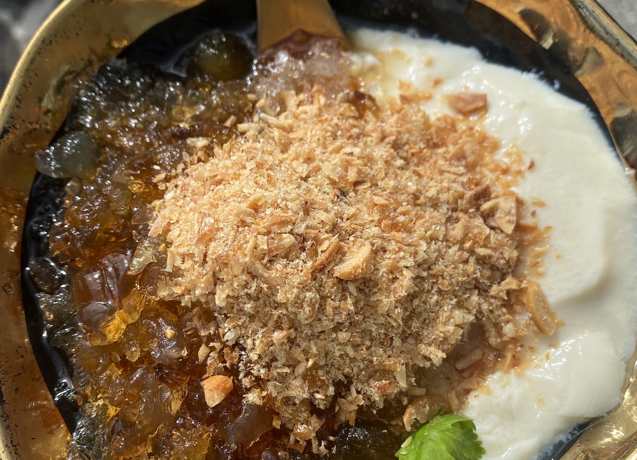 豆花非常綿密細緻,配料桃膠也比較少見,吃起來QQ的,沒什麼特別的味道,上面撒的麥芽花生粉很解膩,還有那一葉的香菜非常畫龍點睛,整體吃起來很好吃,就是價格稍為貴,因為份量也不是很多,沒吃過可以去嘗試看看