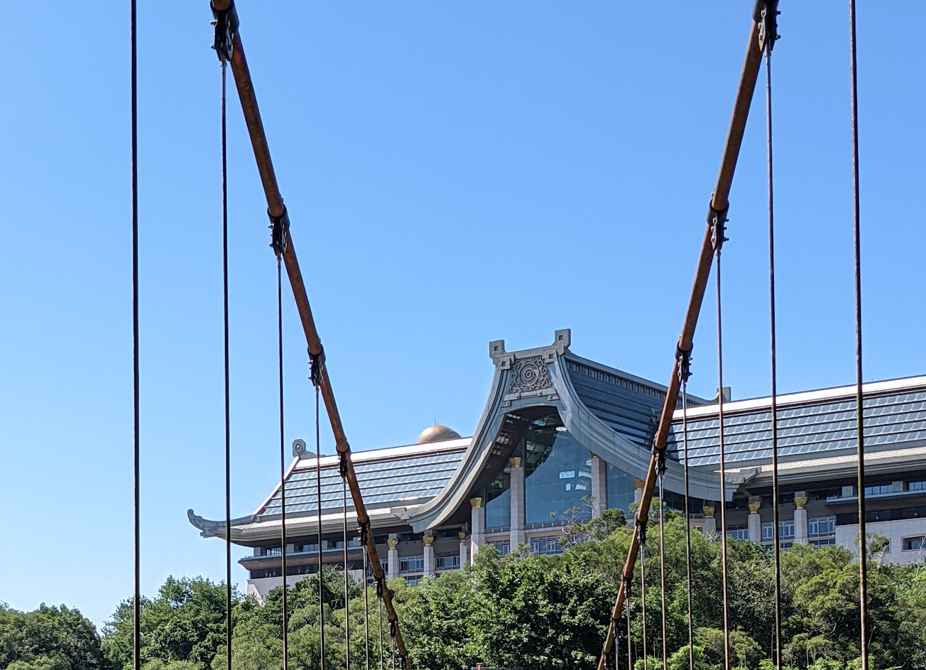 小小迷你的吊橋,可以欣賞峨嵋湖的風景,入口處有街頭藝人的演奏,有薩克斯?,另外一頭有二胡。 …