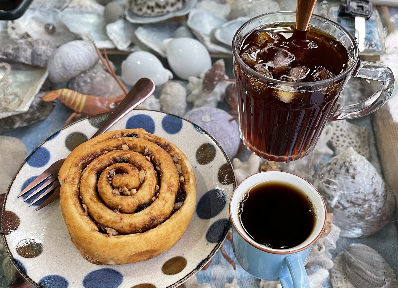 老闆很熱情介紹自己炒的咖啡豆,還推薦了私房景點,讓沒安排甚麼行程的我們多了點方向。 點心是核桃黑糖卷,沒有肉桂,淡淡的黑糖香氣讓人心情大好。 還有當季的桑葚奇亞籽果汁,是自家種的桑葚,酸甜恰到好處,很適合天熱時來一杯消暑。