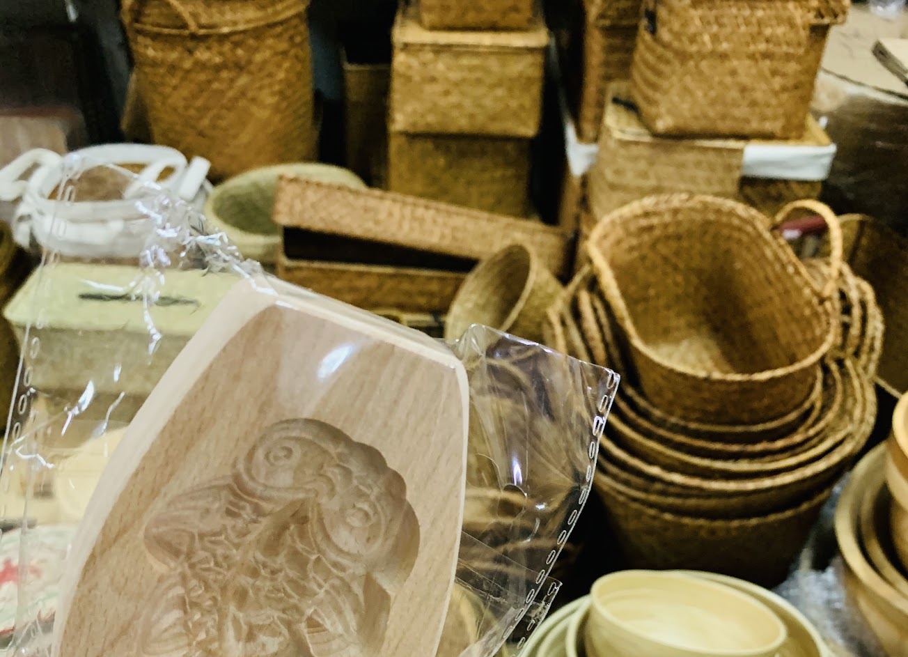 有很多籃子袋子。店裡擺滿了竹子和木頭製成的生活用品,光是看著就很有趣☺擠滿了日本人,但是…