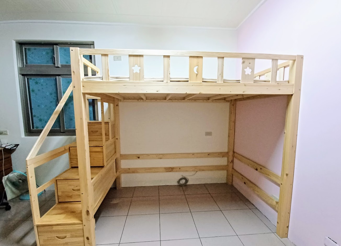 訂購師傅特製加高護欄的高架床,以及師傅到府安裝加固,讓安全性提高許多喔!