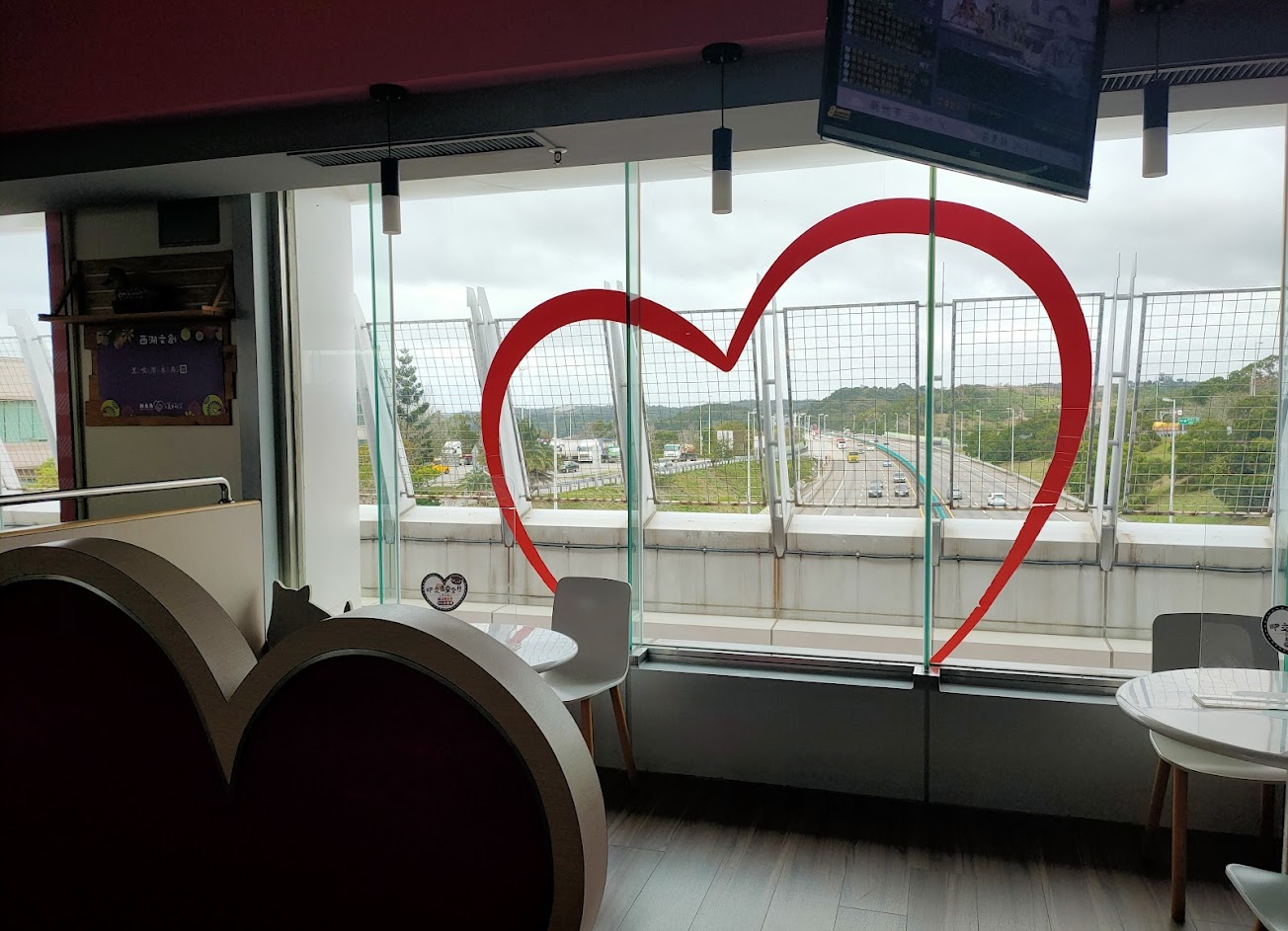 南北向有連結走廊,可坐在沙發上吃美食一邊欣賞高速公路夜景,相當舒適的休息區.