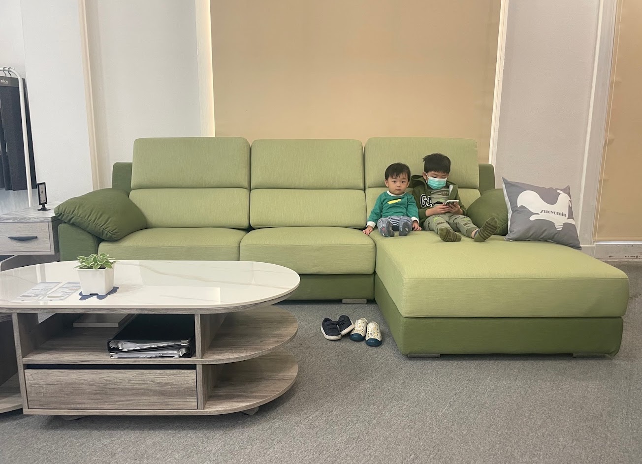 今天接待我們的員工- 曉佩,真的熱心又認真❤️,一直有在看其他家沙發工廠,但是都有諸多限制條件及加價,但是坐又銘的選擇多樣搭配,價格也公道。